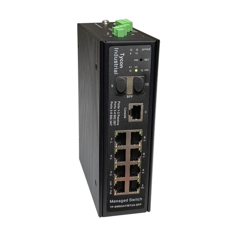 The TP-SW8GAT/BT/24-SFP Power over Ethernet (PoE) 10 port Gigabit switches offered by Tycon® are fully automatic high speed Layer 2+ Ethernet manageable switches. The switch has user configurable PoE ports to provide 802.3AT, 802.3BT and Passive 24V PoE which enables powering different devices from the same PoE Switch. It’s two 1Gb SFP fiber ports accept standard single mode or multimode fiber transceivers.