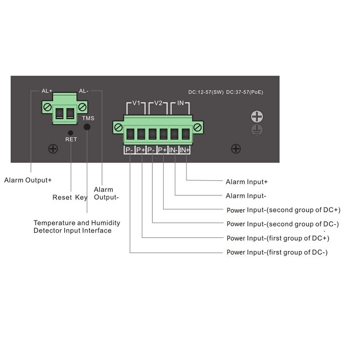 LED’s – Normal State | Port 9-10: (SFP LED) PoE Port 1-2:(Green=48V; Orange=24V); Link port:(Green=Link LED) Port 3-8:(Green=Link LED; Green=PoE LED) PWR:( Power/system LED), Flashing means Normal Power V1: (Master power LED) V2: (Slave power LED) HW:(Ring network ON LED) |